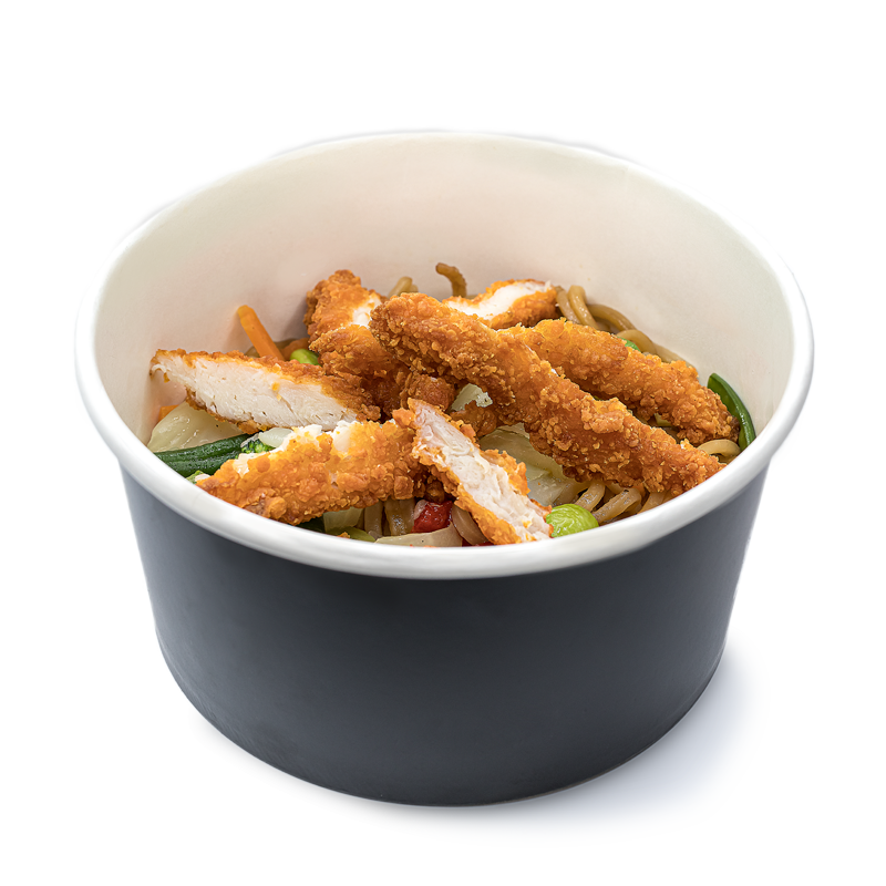 Nouilles japonaises sautées aux légumes et poulet croustillant. Un délice pour les papilles !
