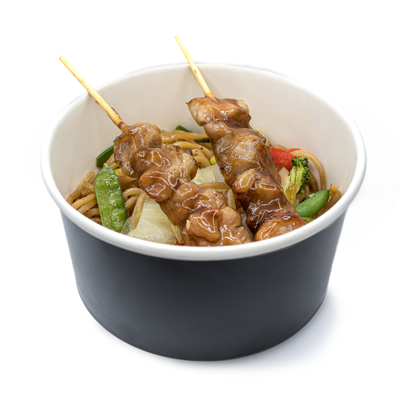 Nouilles japonaises sautées accompagnées de brochettes au poulet. Le mix parfait made in Japan !