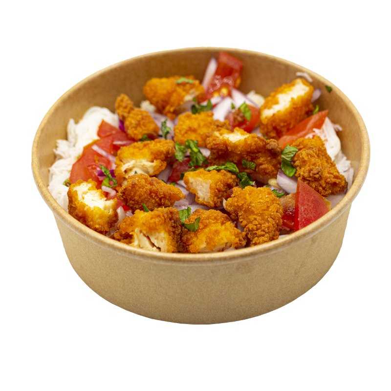 Un poke bowl frais et délicieux.Vermicelle de riz, carotte, pousse de soja, tomate, poulet croustillant, menthe.